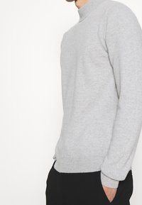 Pull gris clair à col montant en tissu doux. Comprend des manches longues et des poignets et ourlet côtelés. Design simple et classique.