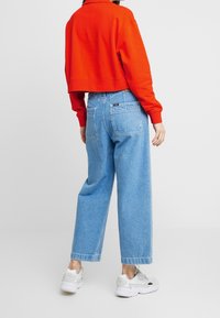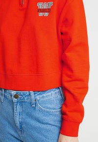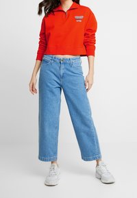 Femme portant un sweat-shirt court à fermeture éclair de couleur orange vif avec le logo "Wrangler" et un jean en denim bleu clair taille haute, mains dans les poches.
