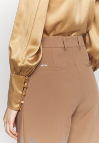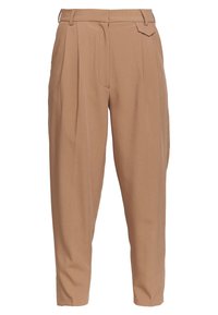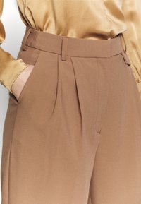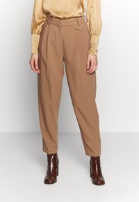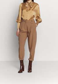 Pantalons plissés beiges avec taille haute et jambes fuselées, associés à un chemisier beige brillant et des bottines à talons en croûte d'alligator marron.