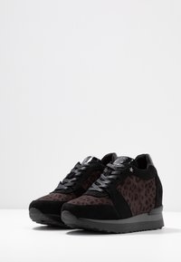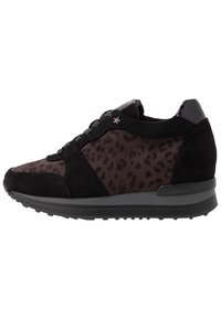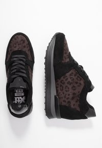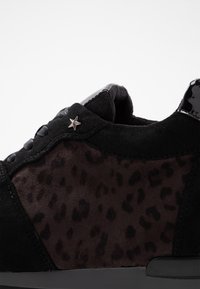 Baskets noires avec un motif léopard, présentant des accents en daim et en vernis, un design incurvé et une semelle en caoutchouc texturé.