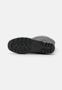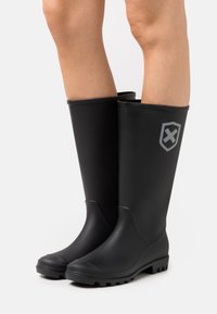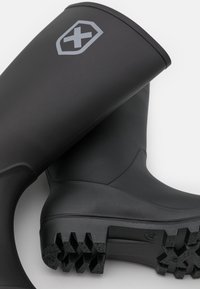 Bottes noires en caoutchouc jusqu'aux genoux avec une semelle texturée, présentant un logo de protection sur le côté. Matériau lisse et design droit.