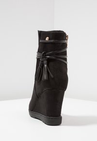 Bottes compensées en daim noir avec fermeture éclair, dotées de brides noires et d'un détail à pompon, portées avec un jean bleu coupé au-dessus de la cheville.