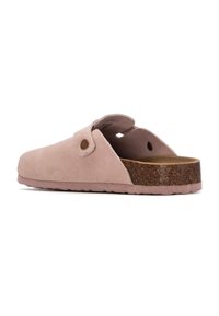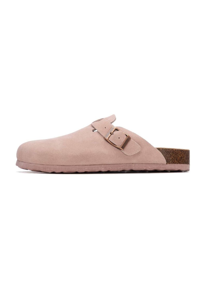 Sabot en daim rose pâle à enfiler avec boucle métallique réglable et semelle en liège marron, vu de côté sur fond blanc.