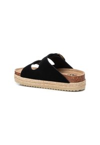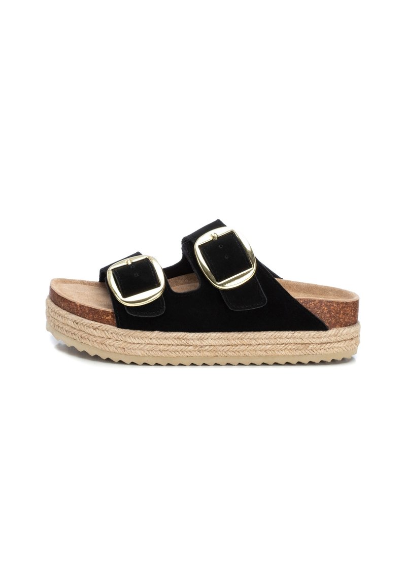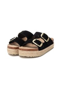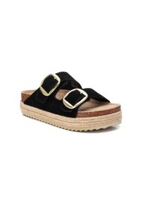 Sandales à glissière en daim noir avec deux sangles ajustables, boucles carrées en or, semelle en liège et semelle en jute. Semelle texturée pour une meilleure adhérence.