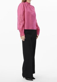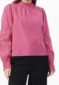 Blouse rose à manches longues bouffantes avec des motifs floraux brodés. Encolure ronde, détails froncés et tissu lisse.
