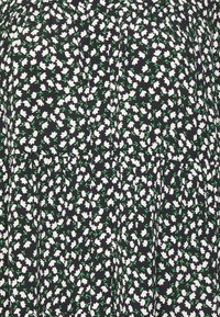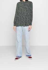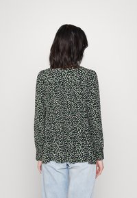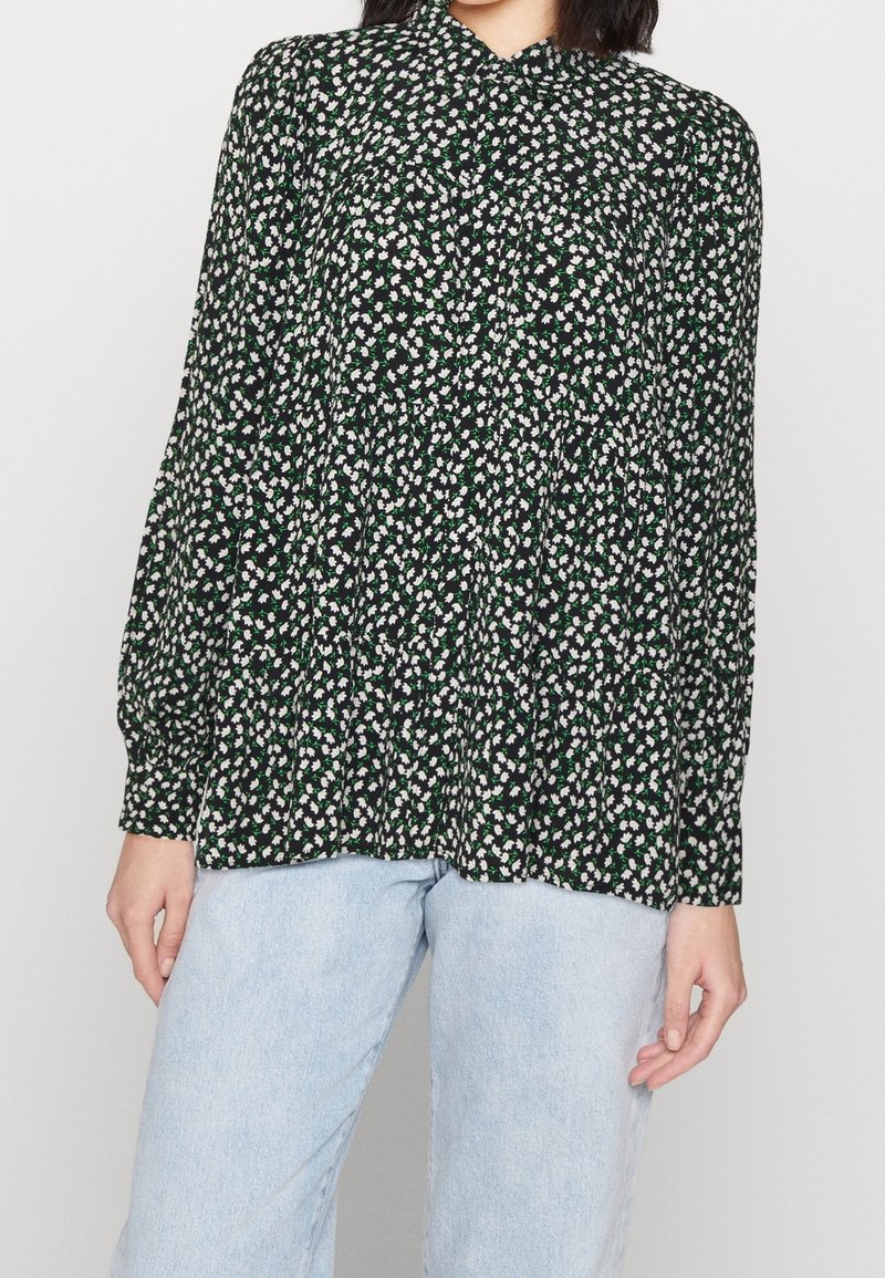 Blouse noire à motifs floraux blancs et verts, col boutonné et design froncé. Manches longues, tissu léger et coupe décontractée.