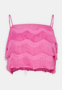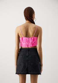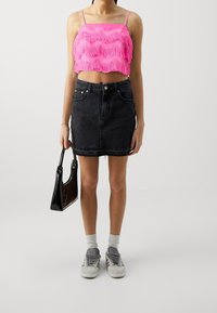 Femme portant un haut court à franges rose vif avec des bretelles fines et une jupe en denim noire taille haute à ourlet effiloché.