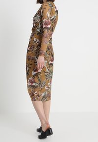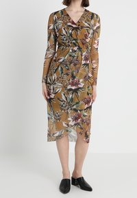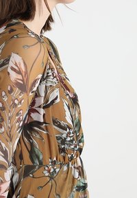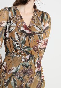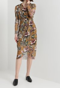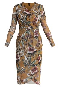 Robe portefeuille florale en marron avec des manches longues. Elle présente un décolleté en V, un ourlet asymétrique et un mélange de fleurs et de feuilles vibrantes.
