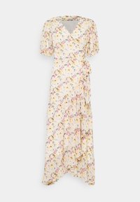 Robe portefeuille fleurie en tissu jaune clair avec des manches courtes bouffantes, un ourlet à volants superposés, ornée de motifs floraux roses et verts.