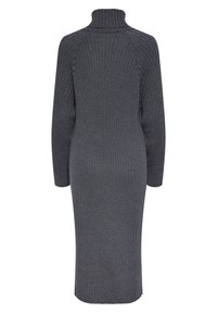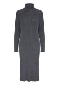 Robe midi en maille côtelée gris foncé à col roulé, manches longues avec poignets ajustés, silhouette droite et ourlet légèrement festonné.