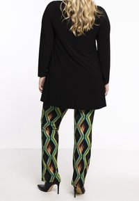 Femme portant une longue tunique noire avec un pantalon à motifs géométriques colorés et des bottines à talons hauts pointues noires, mains jointes.
