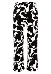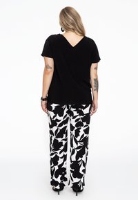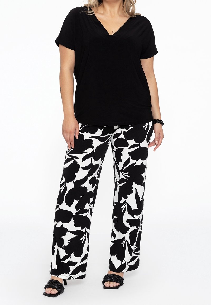 Chemise noire à col en V associée à un pantalon à jambes larges avec un fond blanc et un grand motif floral noir. Portée avec des sandales noires à brides.