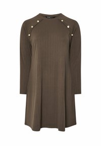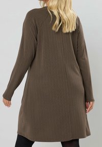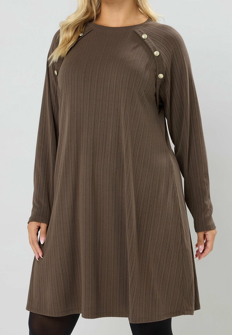Femme portant une robe marron à manches longues côtelée avec des boutons décoratifs le long des coutures des épaules.