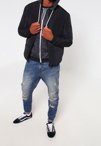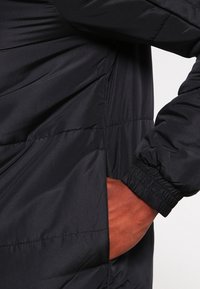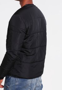 Doudoune noire avec fermeture éclair à l'avant, présentant des coutures horizontales et des poches latérales. Portée sur une chemise grise. Texture lisse.