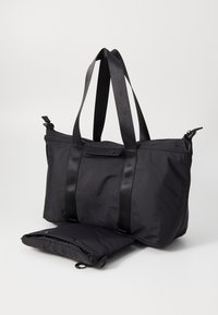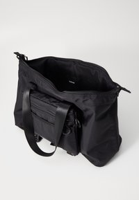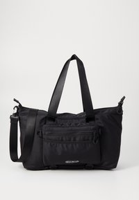 Sac fourre-tout en nylon noir avec deux poignées supérieures, bandoulière réglable et poche avant zippée avec logo.