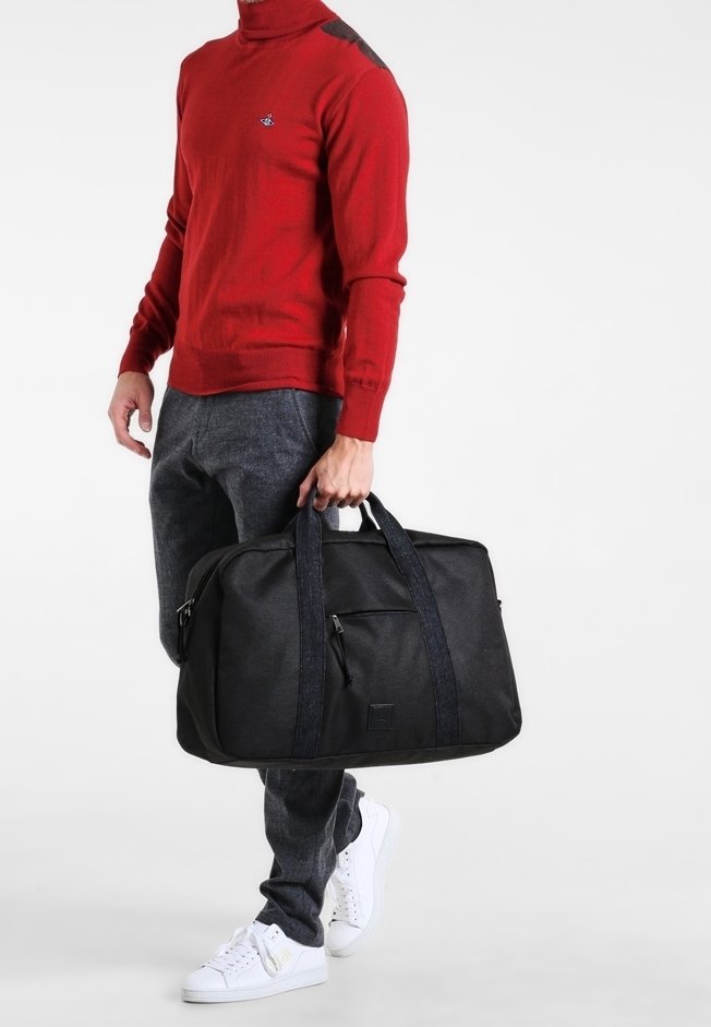 Personne portant un col roulé rouge et un pantalon gris, tenant un grand sac de sport noir avec deux poignées, debout sur un fond blanc.
