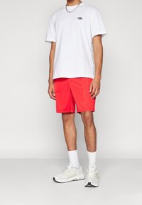 Homme portant un short rouge vif jusqu'aux genoux, des chaussures de sport blanches, des chaussettes blanches montantes et un T-shirt blanc, debout devant un fond uni.