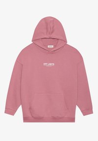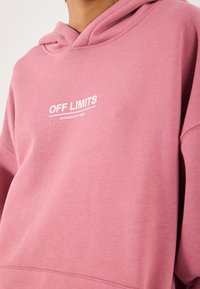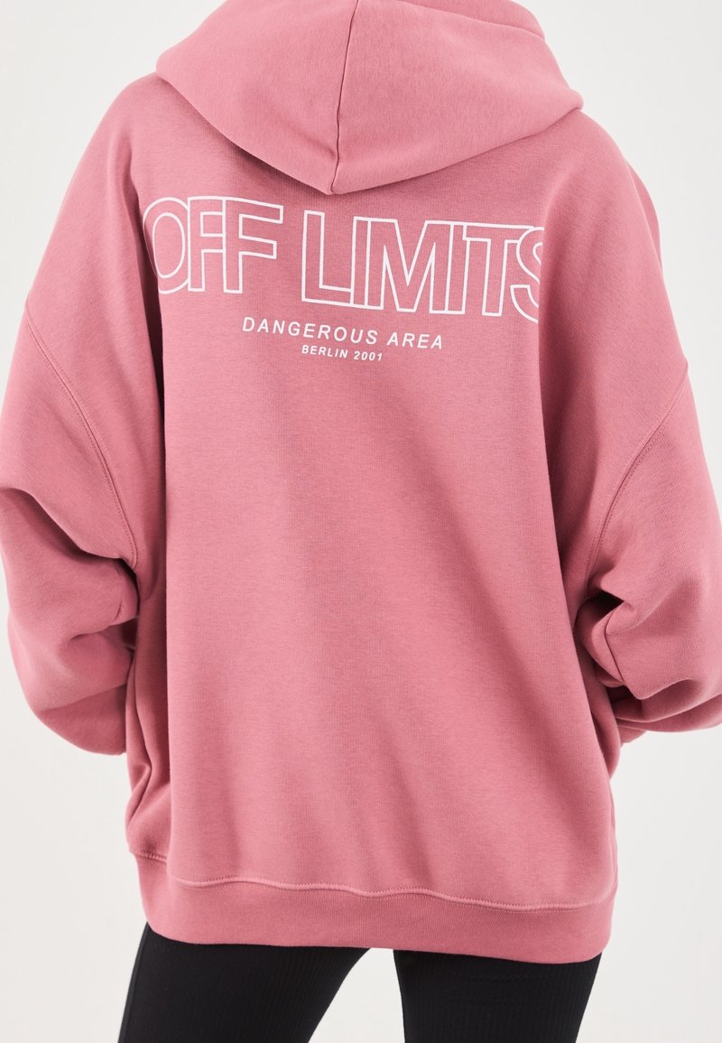 Personne portant un sweat à capuche rose oversize avec un texte blanc "OFF LIMITS DANGEROUS AREA BERLIN 2001" au dos, associé à un pantalon noir.