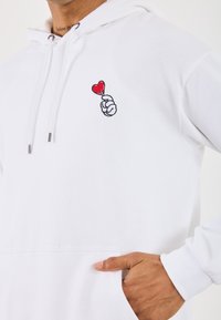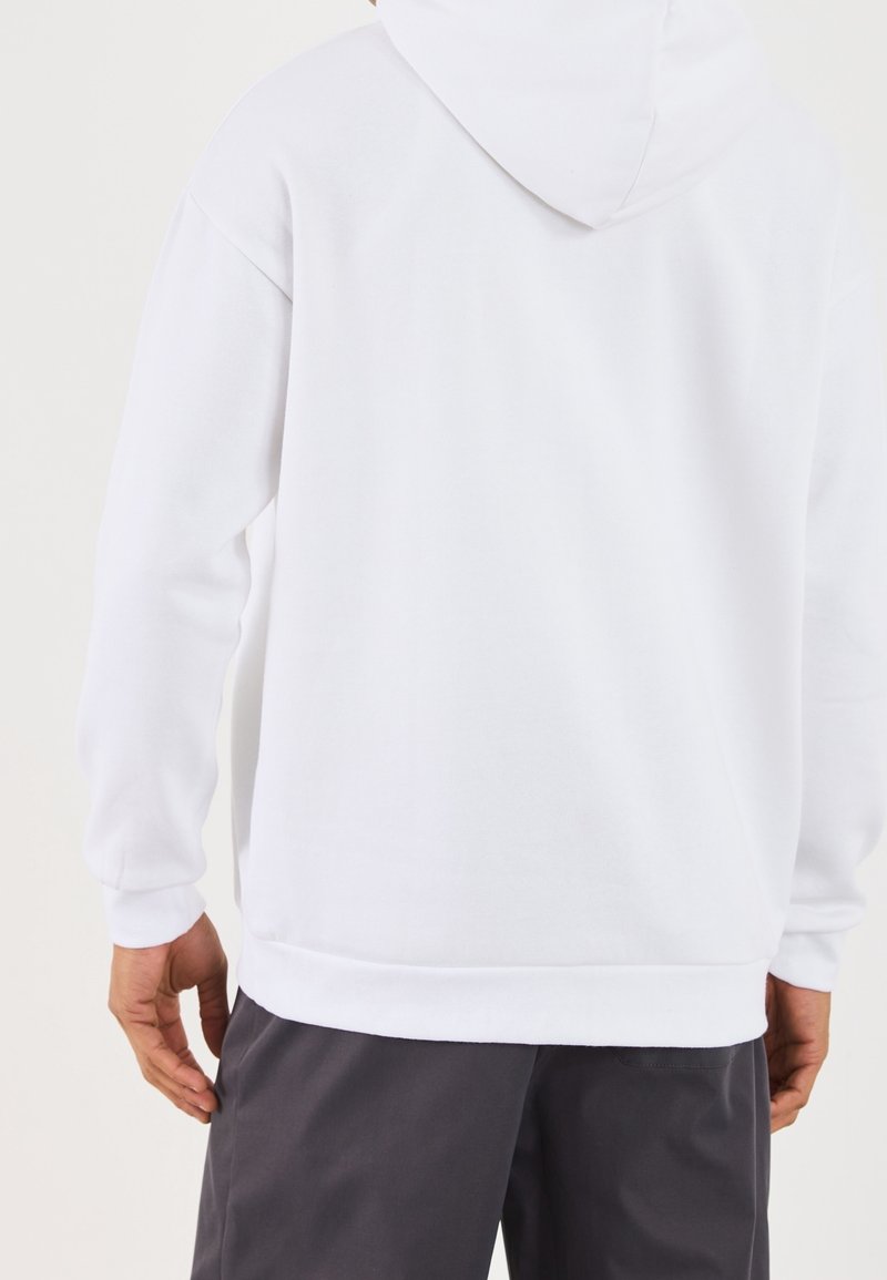 Personne portant un sweat à capuche blanc uni et un pantalon gris foncé, vue de dos sur un fond neutre.