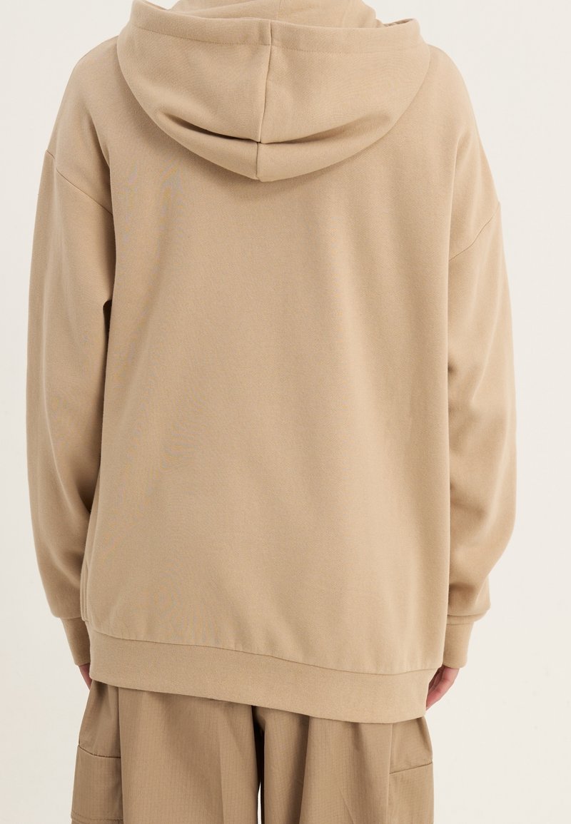 Sweat à capuche beige avec capuche, coupe ample, tissu texturé et poignets côtelés. Le dos présente une surface lisse sans ornements.