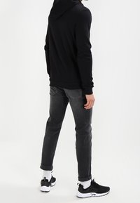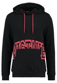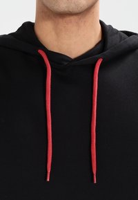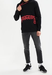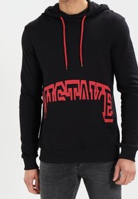 Homme portant un sweat à capuche noir avec des cordons rouges et un motif graphique rouge audacieux sur la poitrine, associé à un jean gris foncé.