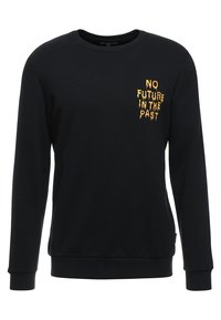 Sweat-shirt noir avec texte jaune « NO FUTURE IN THE PAST » sur un graphisme abstrait, entouré de grands caractères japonais blancs.
