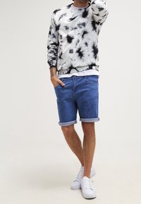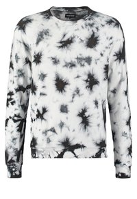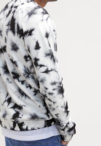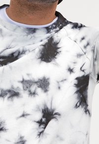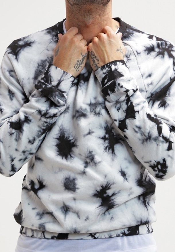 Homme portant un sweat-shirt tie-dye noir et blanc avec les mains près du col, montrant des tatouages sur les doigts et la partie inférieure du visage visible.