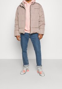 Veste matelassée beige clair avec fermeture éclair, dotée d'un logo et d'une capuche attachée ; associée à un sweat à capuche rose clair et à un jean bleu.