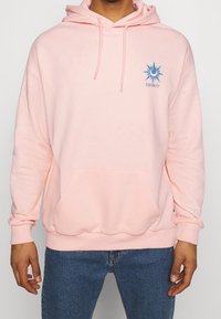 Sweat-shirt à capuche en rose poussiéreux avec logo Adidas trefoil blanc, en coton, poche avant et poignets côtelés. Porté avec un short en denim bleu clair.