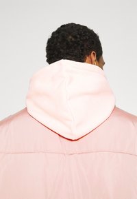 Homme portant une veste matelassée beige par-dessus un sweat à capuche rose, un jean bleu retroussé et des baskets blanches avec des accents orange, debout sur un fond uni.