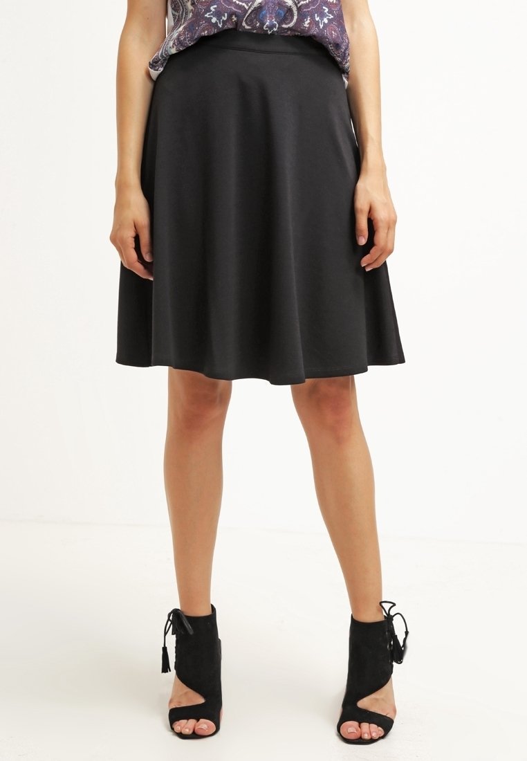 • Jupe noire évasée avec des plis, fabriquée dans un tissu lisse. Associée à un pull en beige texturé et des chaussures à talons hauts noires.