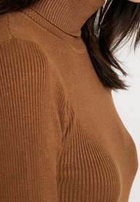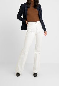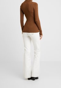 Haut marron à manches longues côtelées avec un col montant, associé à un jean blanc taille haute avec une fermeture à boutons et des poches.
