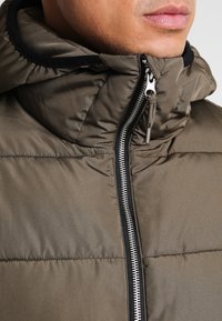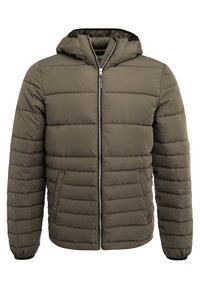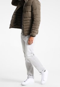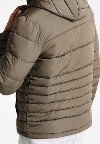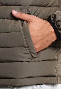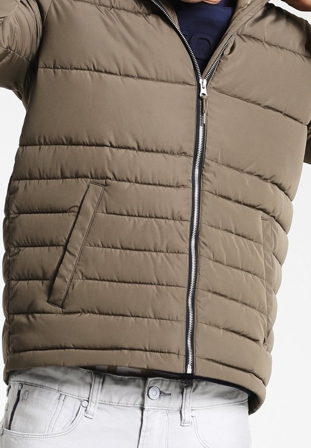 Homme portant une veste matelassée marron zippée par-dessus une chemise bleu foncé et un jean de couleur claire, les bras levés hors du cadre.