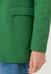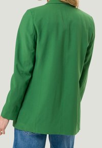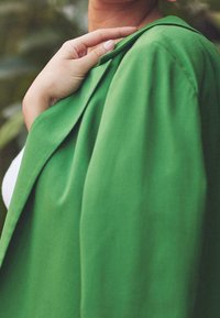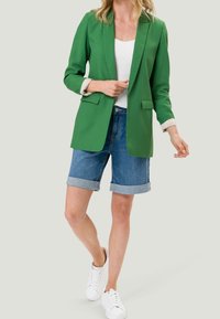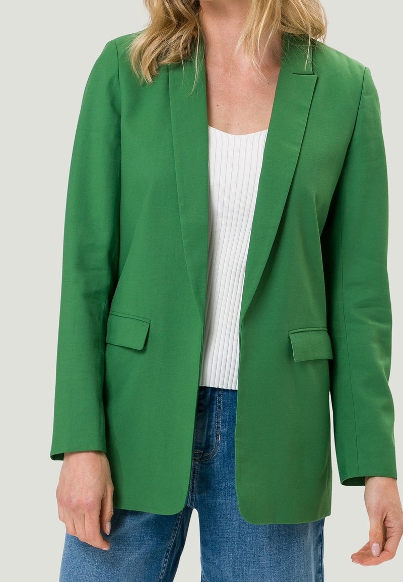 Blazer vert en tissu uni, avec un col cranté, des manches longues et deux poches avant, porté par-dessus un top blanc côtelé.