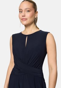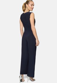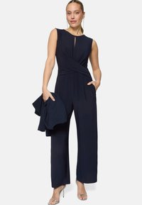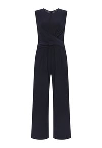 Femme portant une combinaison sans manches bleu marine avec encolure découpée en clé et pantalons à jambes larges, mains dans les poches, debout devant un fond blanc.