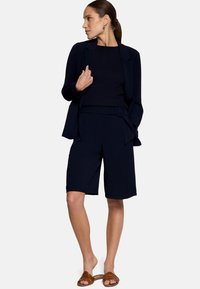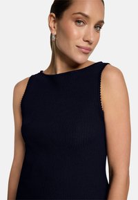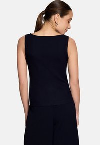 Femme aux cheveux tirés en arrière portant un haut noir sans manches côtelé et un pantalon noir à jambes larges sur un fond gris clair.