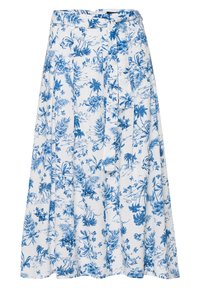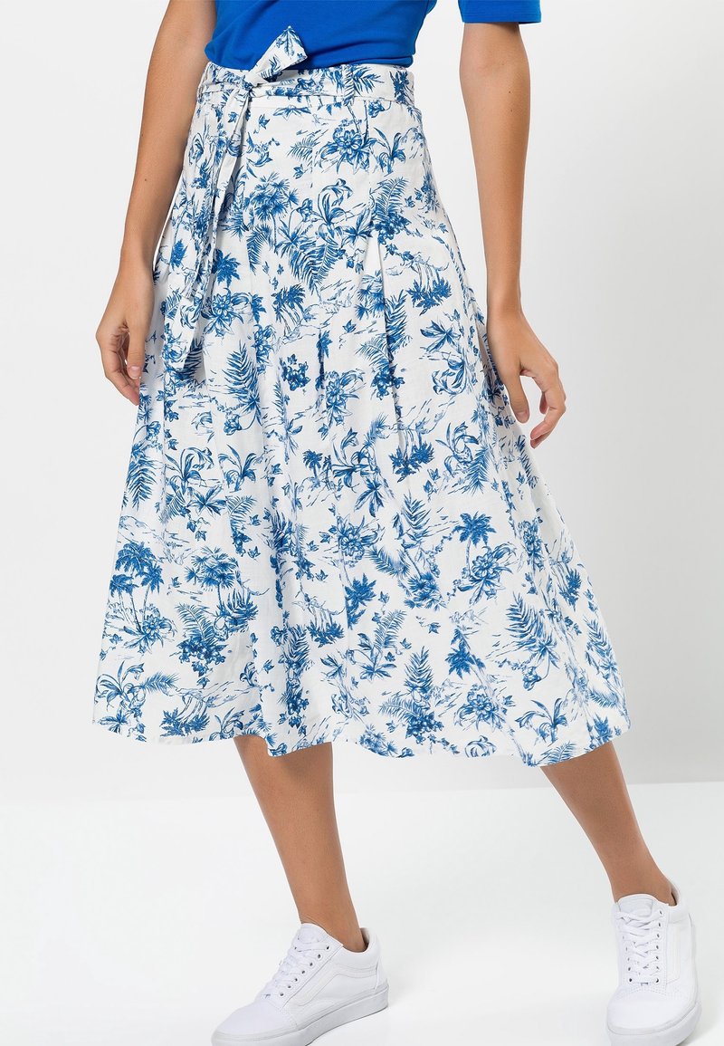 Jupe midi fleurie en tissu blanc avec imprimé botanique bleu. Comprend des poches latérales, des plis et une ceinture nouée. Portée avec des baskets blanches.