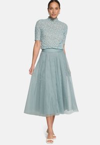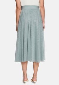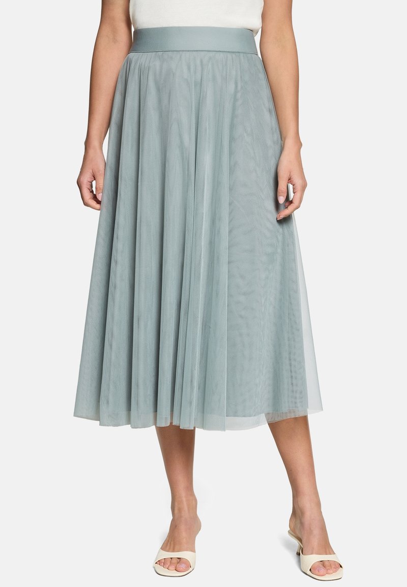 Femme portant une jupe midi en tulle bleu clair avec une ceinture ajustée et des sandales blanches à bout ouvert sur un fond blanc.