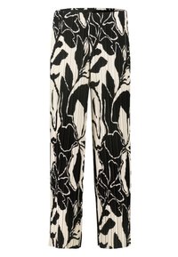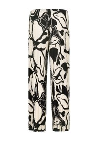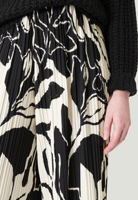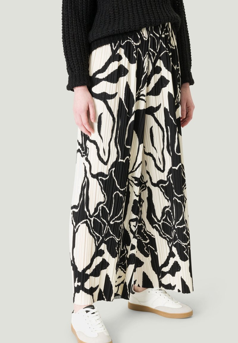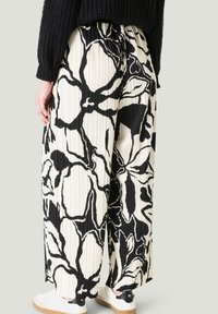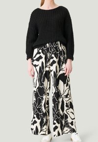 Personne portant un pull noir texturé et un pantalon plissé à jambes larges avec un motif floral abstrait noir et blanc, accompagné de baskets blanches.