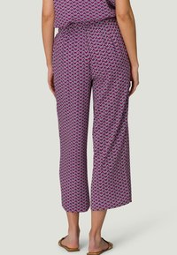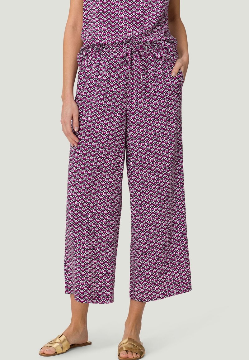 Pantalons larges violets avec un motif ondulé blanc et bleu, dotés d'une taille élastique et de poches latérales, associés à des sandales dorées à enfiler.