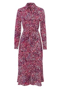 Femme portant une robe fleurie à manches longues boutonnée, avec une ceinture à la taille et des poches, associée à des baskets blanches sur un fond neutre.