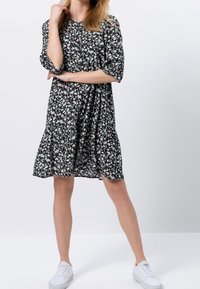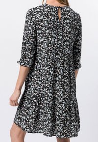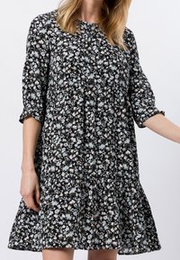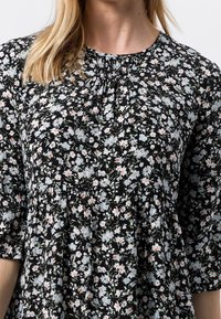 Robe noire à fleurs avec une taille froncée, des manches trois-quarts et une jupe évasée. Présente de petites fleurs roses et bleues sur un fond noir.