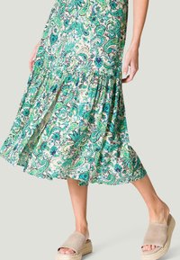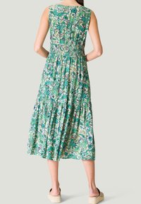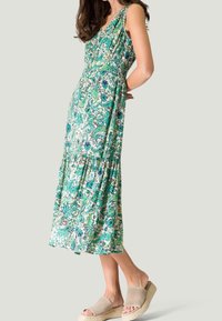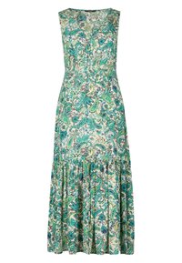 Robe midi sans manches à col en V avec un motif floral paisley vert et bleu, détail de jupe froncée, portée avec des sandales à plateforme beiges.