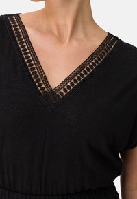 Robe noire avec un décolleté en V, des manches courtes volantes et une taille smockée. La jupe est lâche et s'écoule légèrement, réalisée dans un tissu doux.