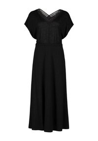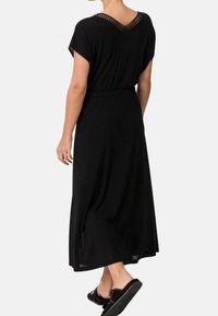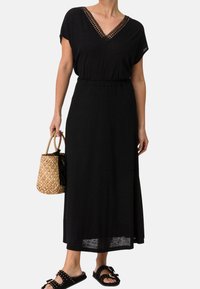 Femme portant une robe maxi noire à encolure en V avec bordure en dentelle et taille élastique, associée à des sandales slip-on noires cloutées.