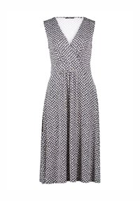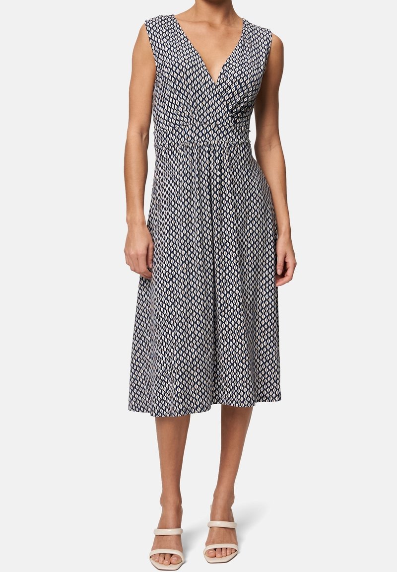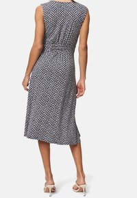 Robe bleu marine à motifs avec un col en V, sans manches, taille cintrée, s'étendant jusqu'au milieu du mollet. Tissu léger et fluide.