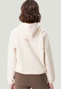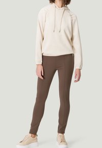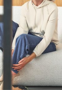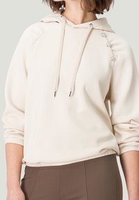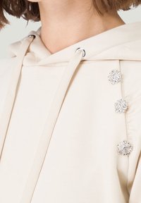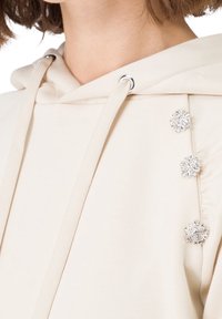 Femme portant un sweat à capuche couleur crème avec trois boutons décoratifs en cristal sur l'épaule et un pantalon marron ajusté.