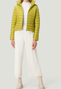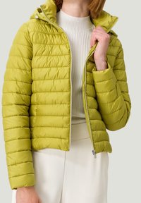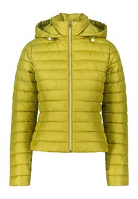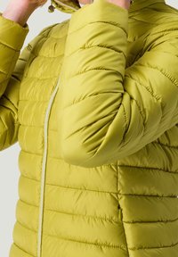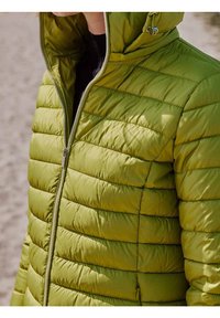 Veste matelassée verte en duvet avec fermeture éclair à l'avant, col montant et manches longues. Texture lisse avec coutures horizontales.
