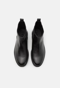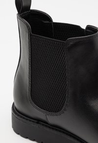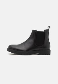 Bottes Chelsea en cuir noir avec panneaux latéraux élastiques et languette à boucle. Dotées d'une semelle en caoutchouc épaisse avec une surface texturée pour une meilleure adhérence.