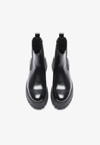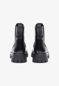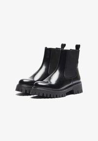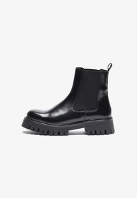 Bottines Chelsea noires en cuir lisse, avec des panneaux élastiques sur les côtés, un embout arrondi, une semelle épaisse et une languette à l'arrière.